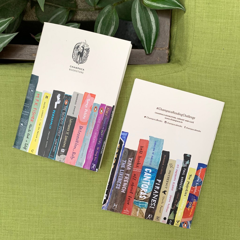 concept: an illustration featuring books recommended for the champaca reading challenge, 2022. the reading challenge is a list of prompts designed to encourage readers to explore new & diverse books through the year. through prompts like “read a book by a trans author” or “read a book set in an indian metropolis”, readers are encouraged to choose their own books that match the prompt, and expand their reading.