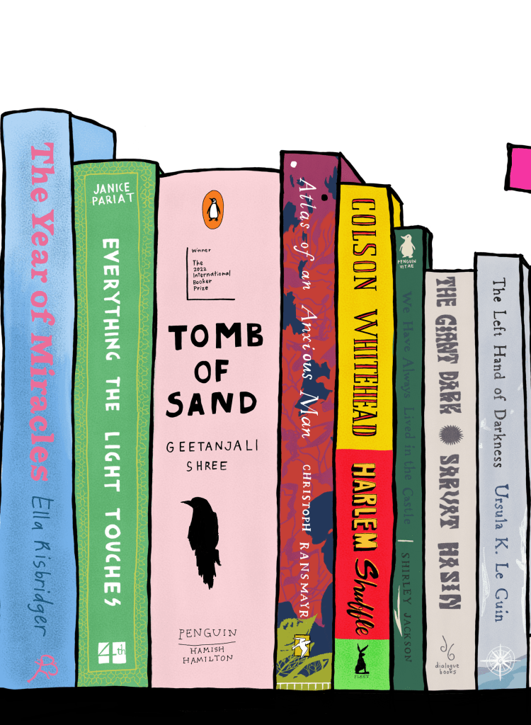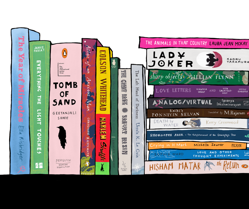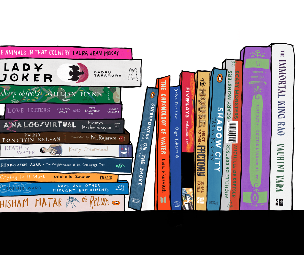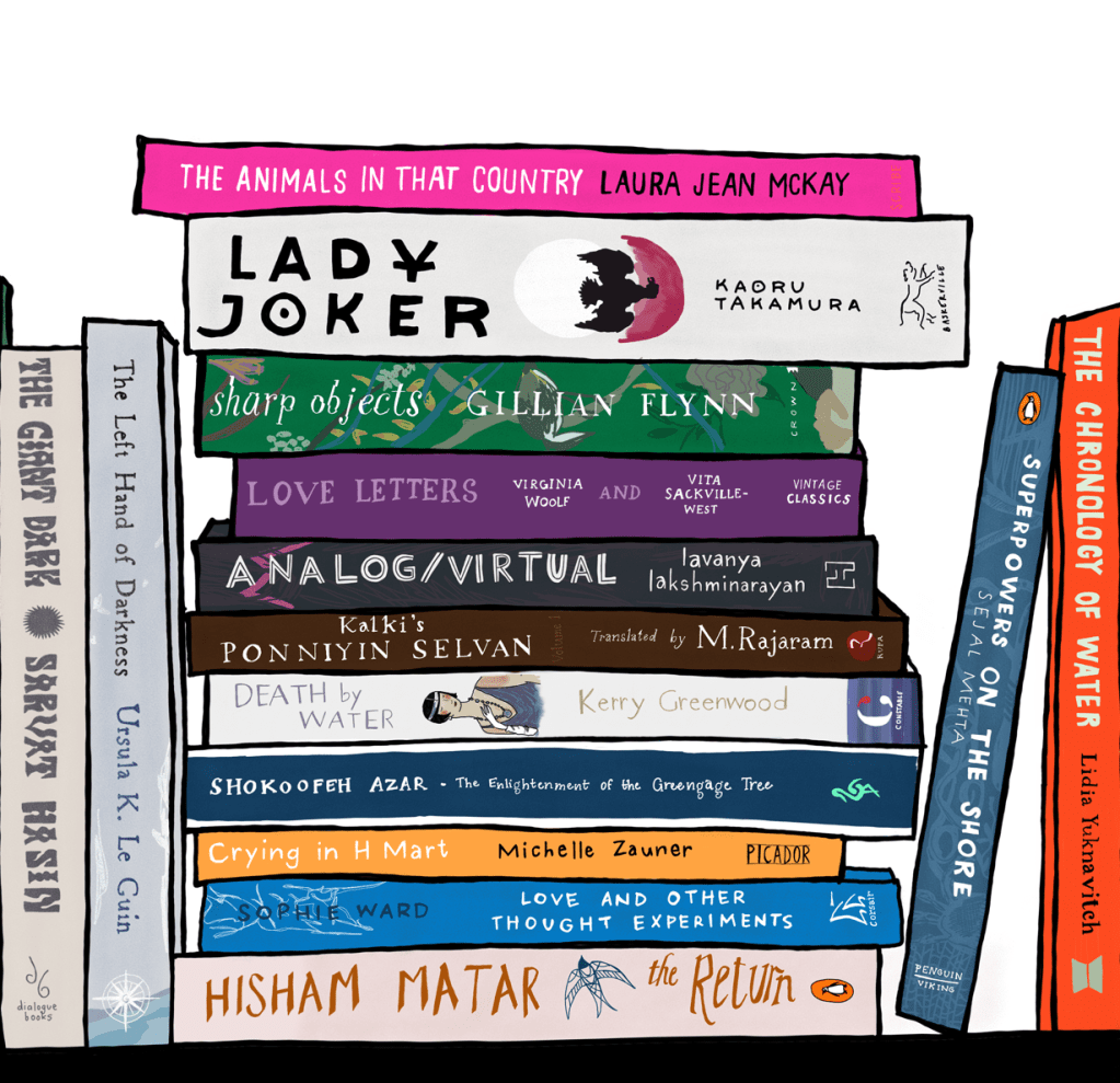 concept: an illustration featuring books recommended for the champaca reading challenge, 2023. the reading challenge is a list of prompts designed to encourage readers to explore new & diverse books through the year.