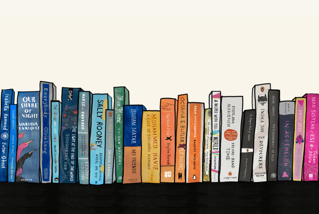 concept: an illustration featuring books recommended for the champaca reading challenge, 2024. the reading challenge is a list of prompts designed to encourage readers to explore new & diverse books through the year.