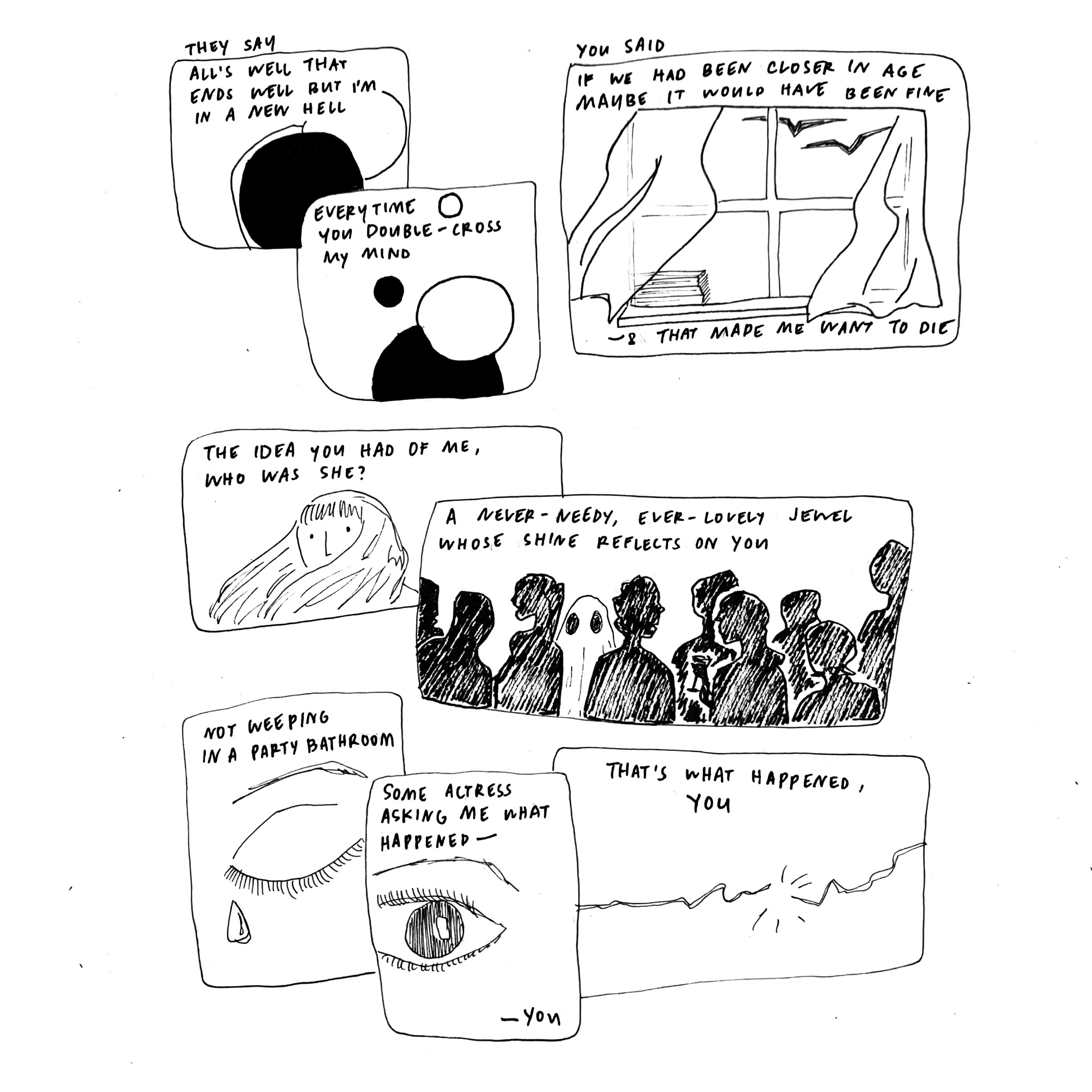 a graphic illustration of the entire song all too well (10 minute version) by taylor swift, in comic-book style, with minimal line art. black-and-white pen illustration.