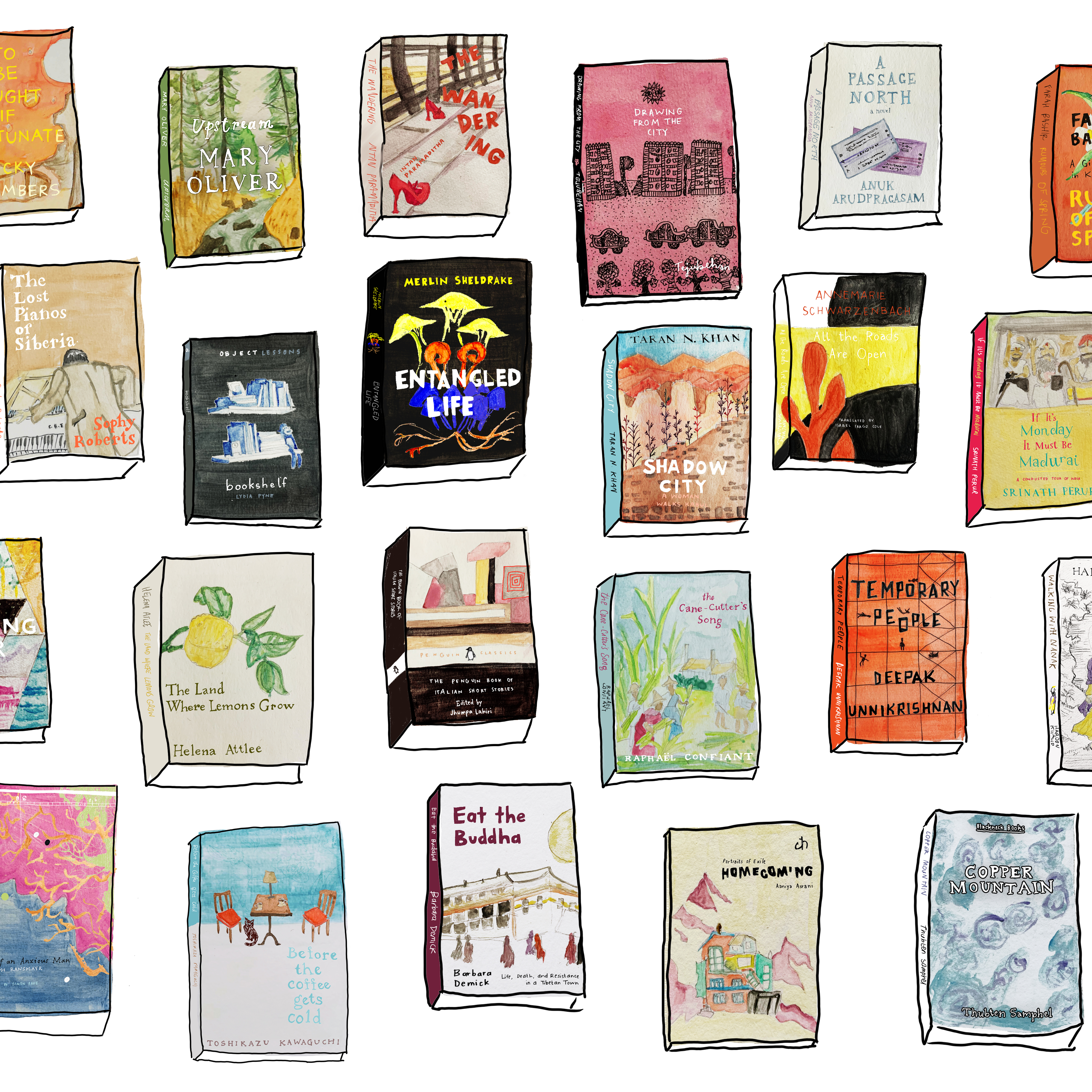 illustrations of the books curated in the theme of ‘travel’. the books chosen explore the theme of travel in different ways: travelling for necessity, travelling inward, travelling through space and time. watercolour.