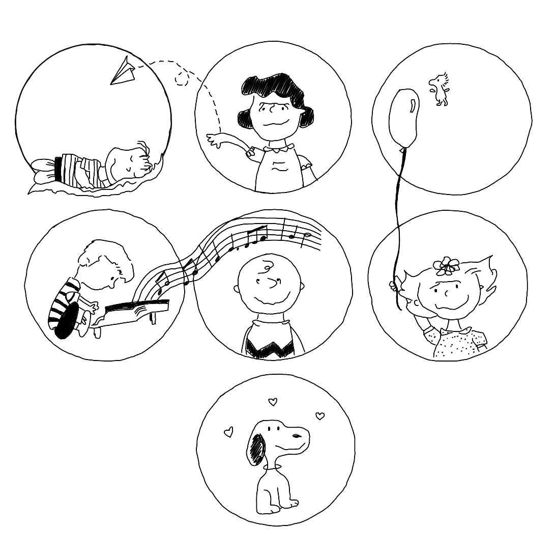 my entry for the uniqlo UTGP2022 contest, to design a t-shirt inspired by peanuts. i drew on the idea of interconnectedness between snoopy & his friends. pen & ink illustration.