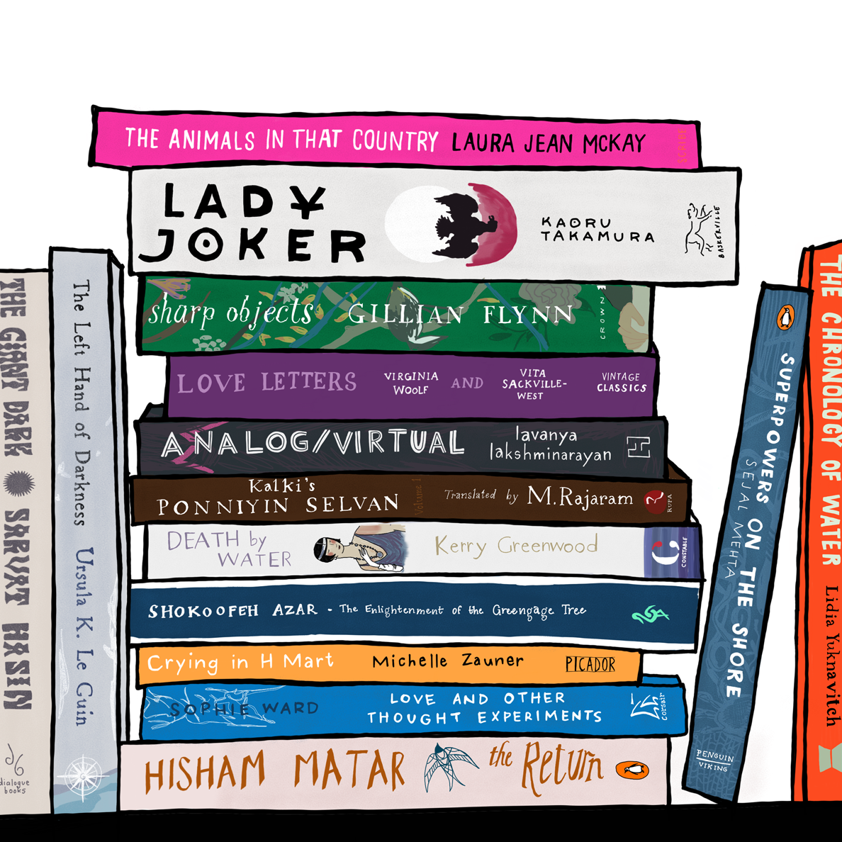an illustration of the best books (and book covers!) that i read in 2022. for these, i drew from scratch, replicating the cover illustrations and typography in my own style.
