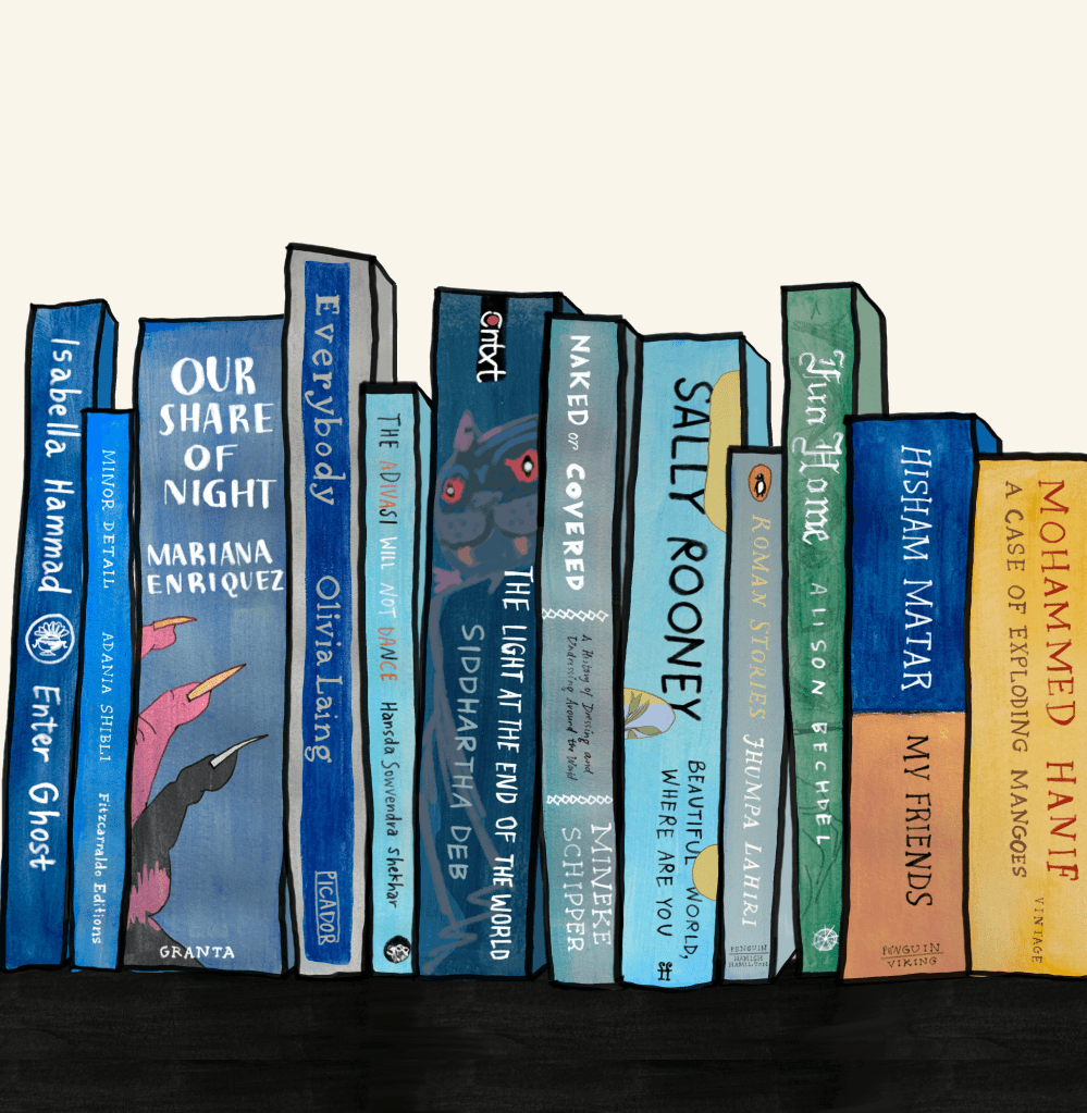 an illustration featuring books for the champaca reading challenge, 2025. the reading challenge is a list of prompts designed to encourage readers to explore new & diverse books through the year. digital + watercolour.