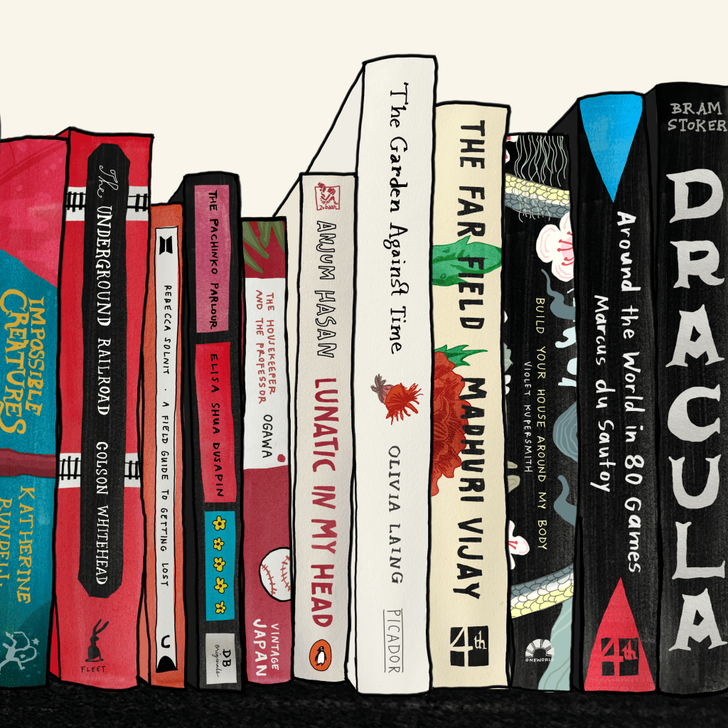 an illustration featuring books for the champaca reading challenge, 2024. the reading challenge is a list of prompts designed to encourage readers to explore new & diverse books through the year. digital + watercolour.