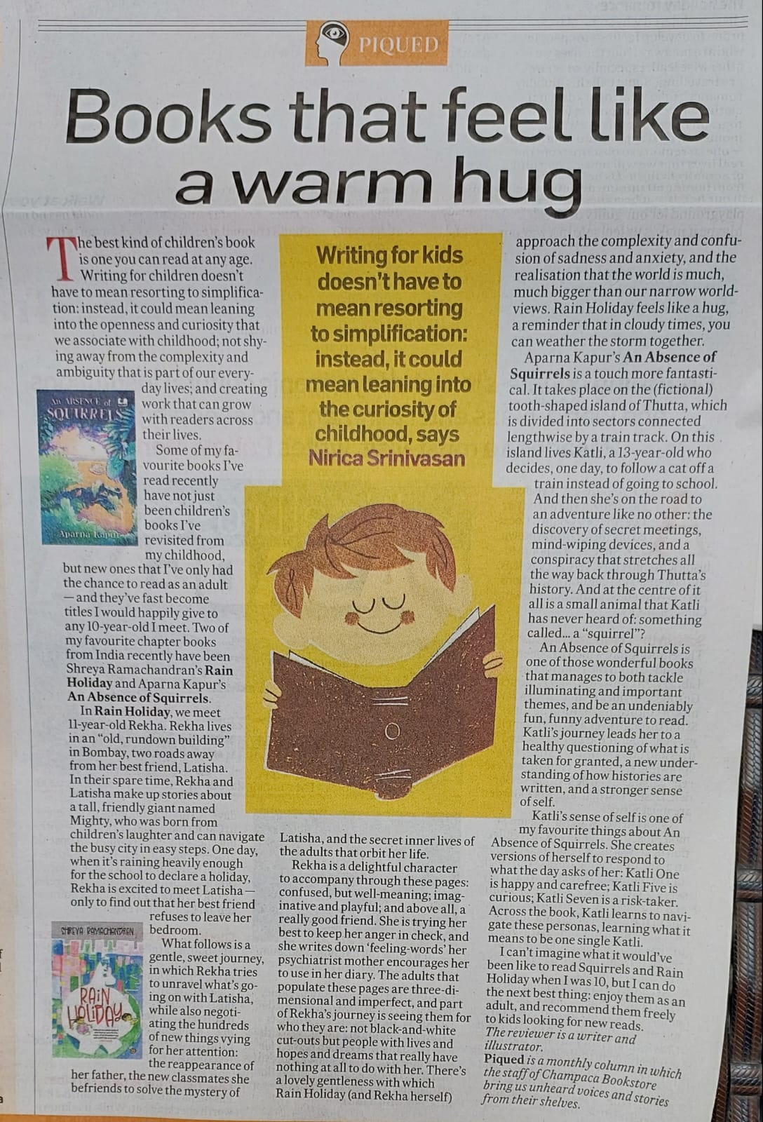 Books that feel like a warm hug: Book Feature on the children’s books An Absence of Squirrels (Aparna Kapur) and Rain Holiday (Shreya Ramachandran) (print and online)